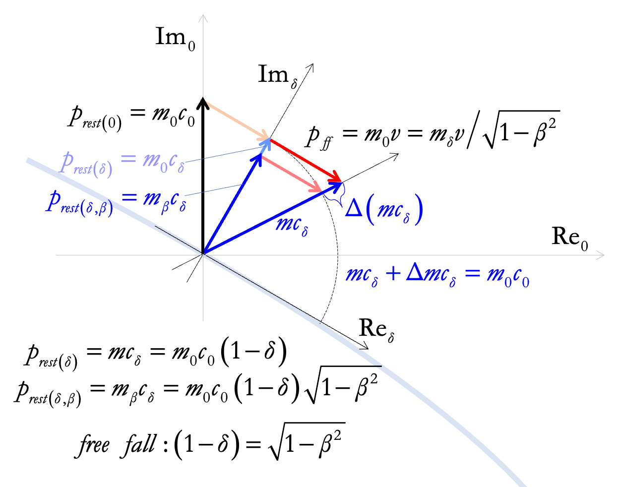 along the volumetric surface dictated by the zero-energy condition, thus being affected by both the decreased velocity by and greater radial distance due to the curvature (which results in the empirically correct Shapiro time delay), while the emitters and receivers are in different energetic states which also affect observations, and - in abstract free-fall starting from far away, motion and gravitational factors become equal (reminescent of the equivalence principle, where “gravitational time dilation